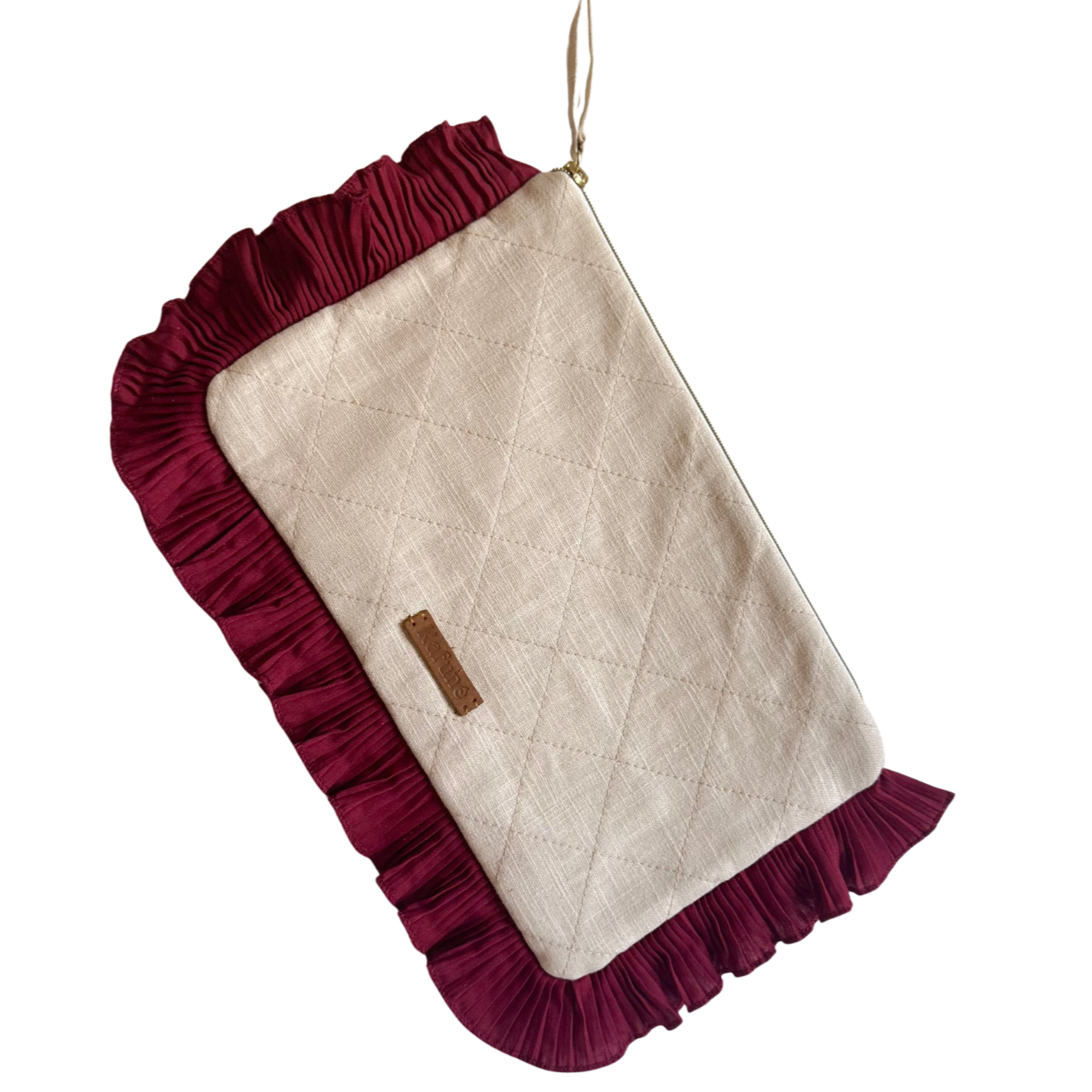 Mala em linho com plissados, feita à mão em Portugal e finalizada com uma etiqueta em pele sintética.