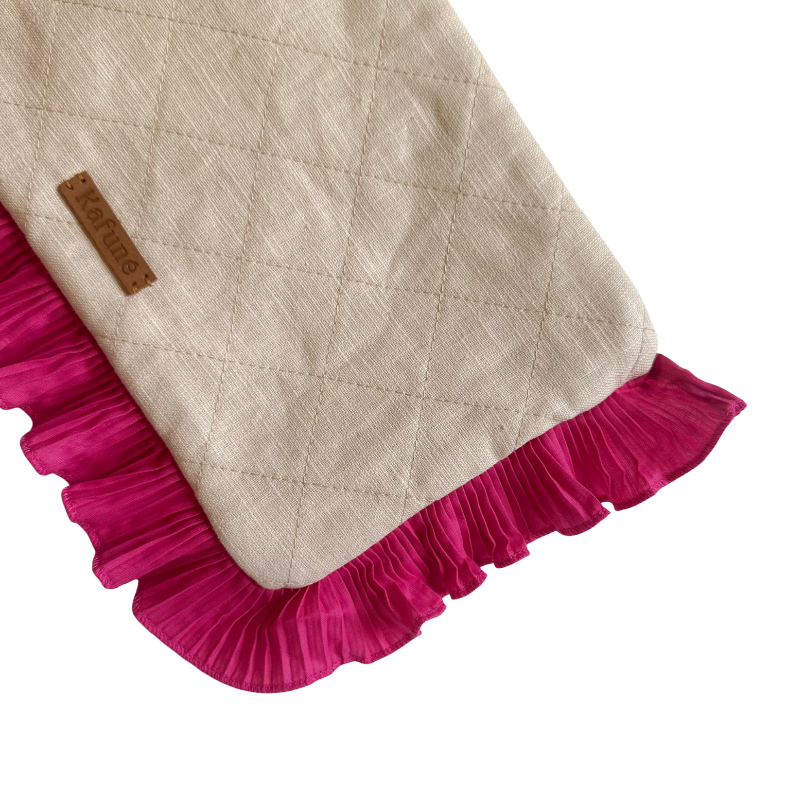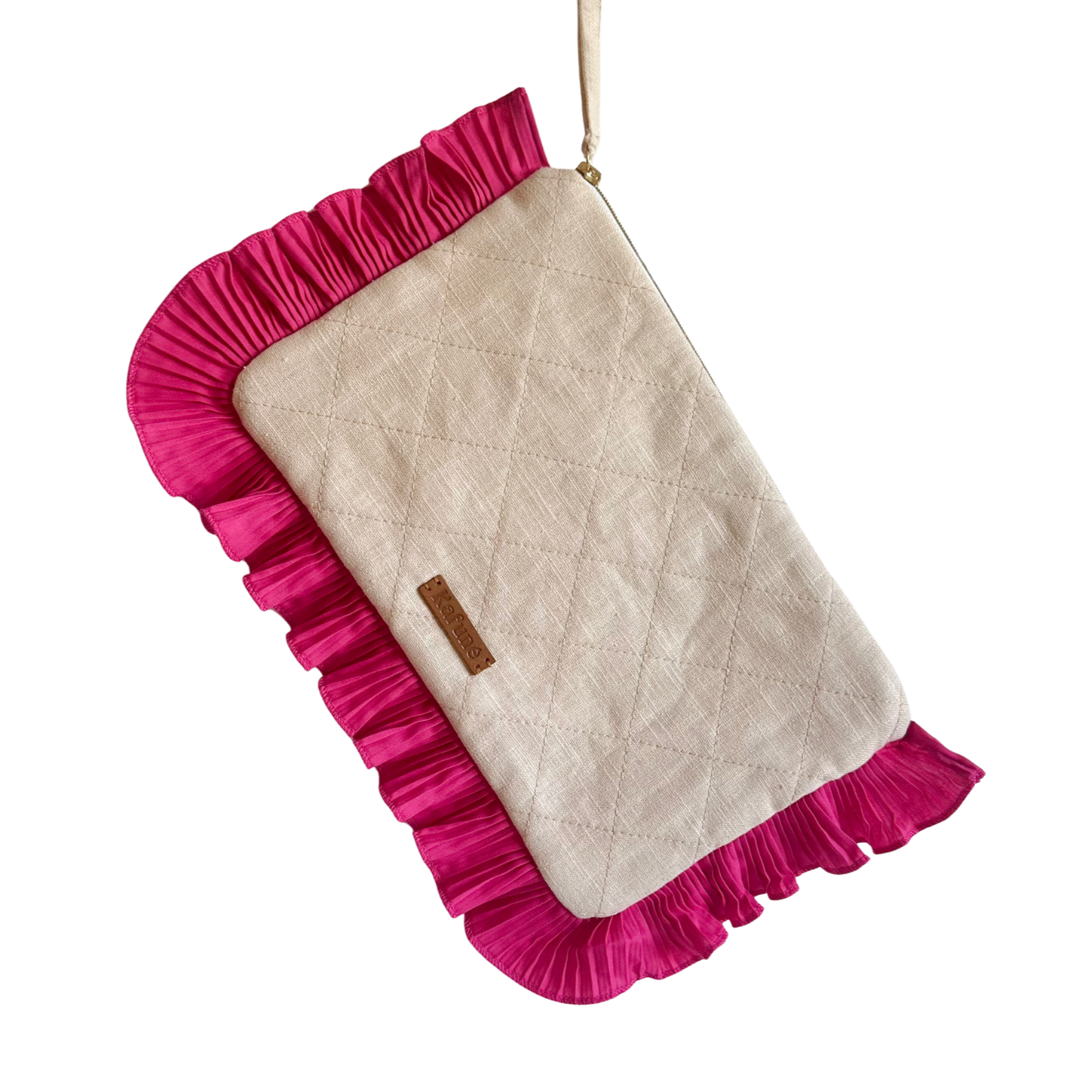 Mala em linho com plissados, feita à mão em Portugal e finalizada com uma etiqueta em pele sintética.