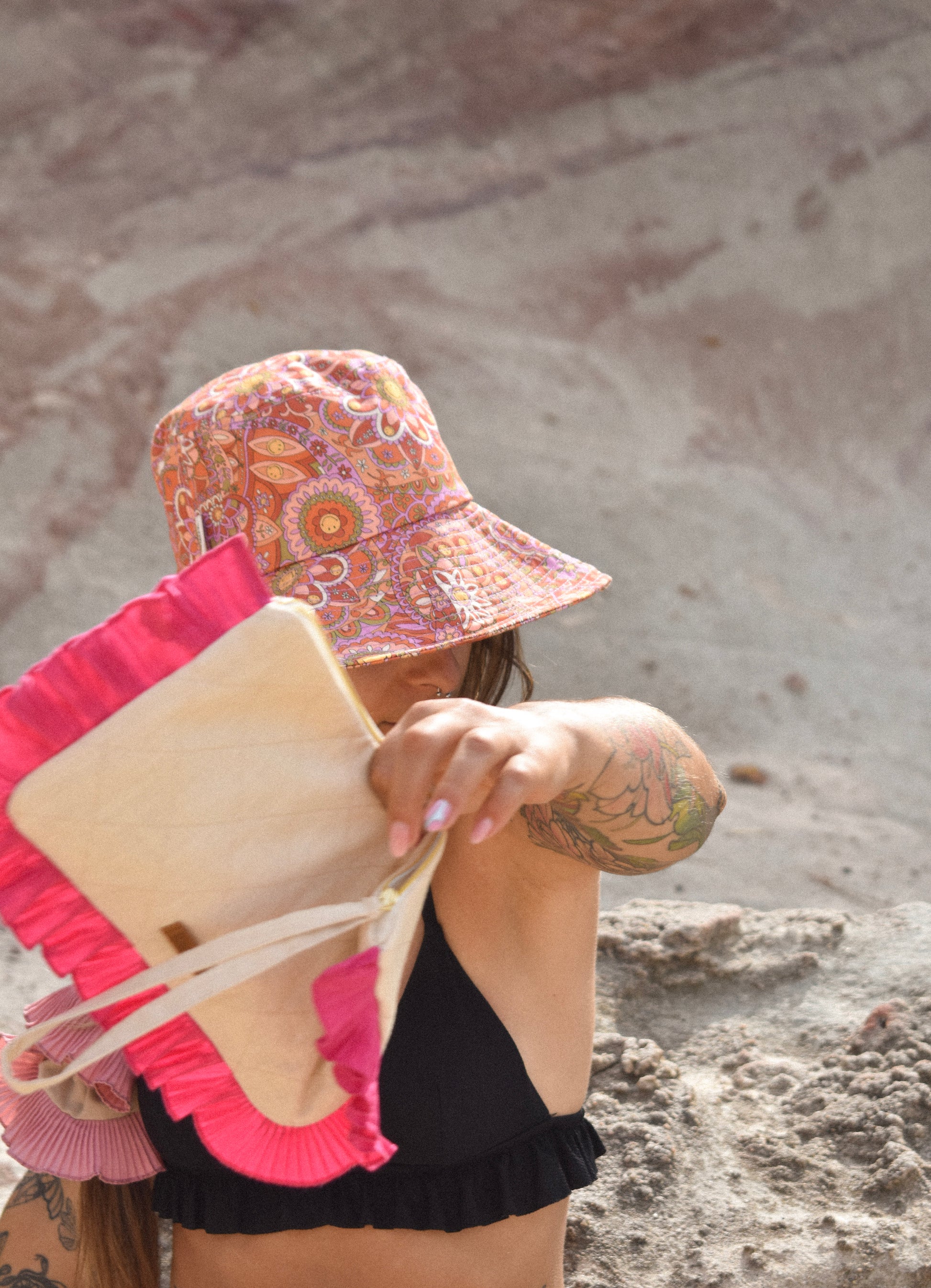 Na versão bege, o fecho combina tecido branco com dentes dourados e inclui um puxador em linho preso a uma argola dourada, tornando o uso mais prático e conferindo um detalhe especial.