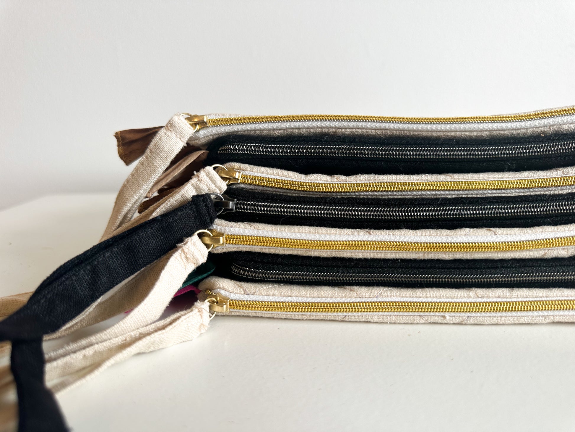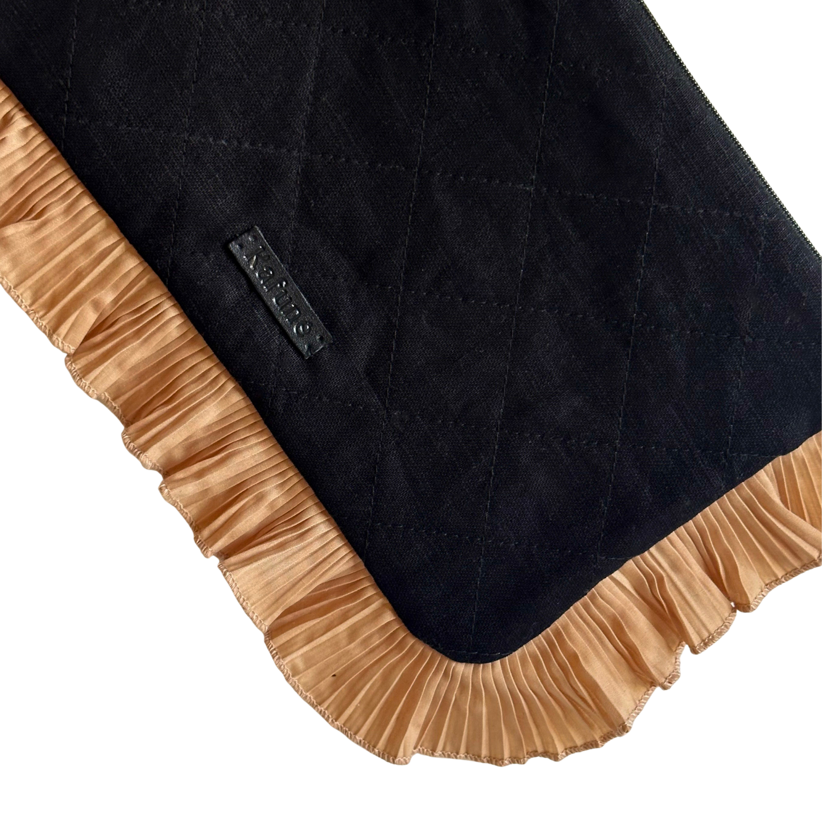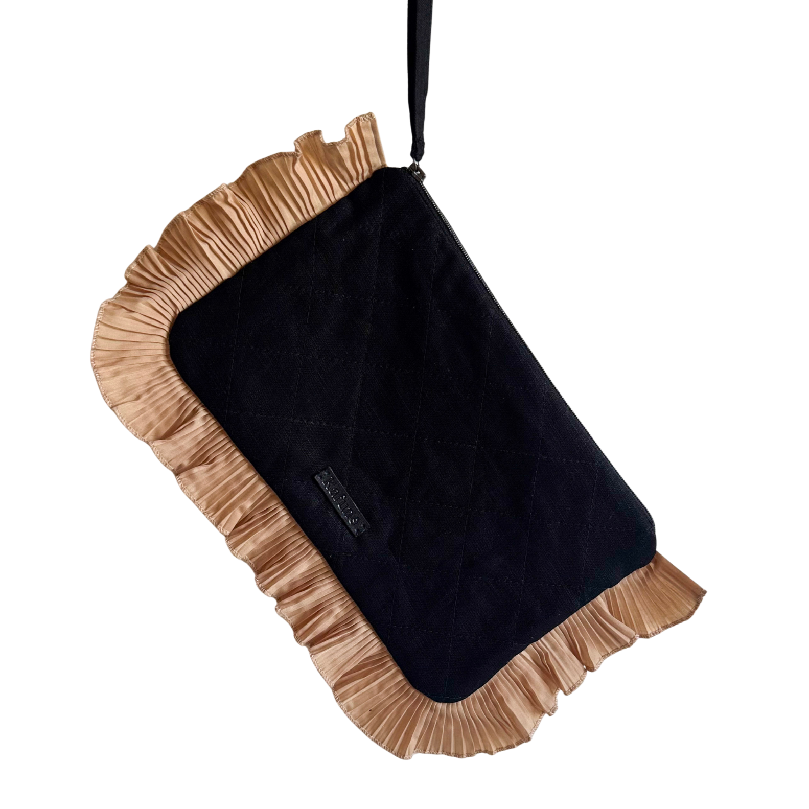 Mala em linho com plissados, feita à mão em Portugal e finalizada com uma etiqueta em pele sintética.